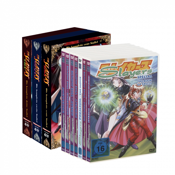 • Umfang: 78 Episoden (Ungekürzte Originalfassung) auf 12 DVDs + Bonusmaterial + jeweils exklusives 7-teiliges Postkartenset inkl. 7er Slayers-DVD-Set mit 5 Movie-DVDs und 2 OVA DVDs